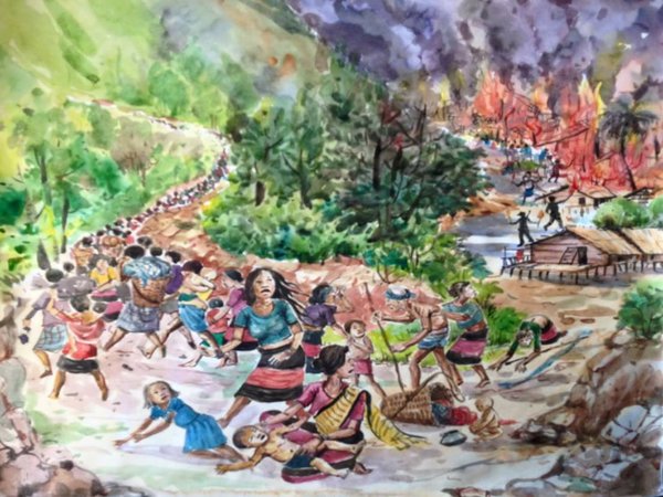 [শিল্পী সাপু ত্রিপুরার আঁকা ছবি, যে ছবিটি পার্বত্য চট্টগ্রামে প্রতিটি গণহত্যা আর ঘরবাড়ি অগ্নিসংযোগে কারা কারা সবসময় জড়িত তার একটি ক্লাসিক উদাহরন তুলে ধরে ৷ ]
