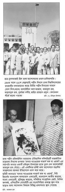 শহীদ রফিক উদ্দীন (আলোকচিত্রী: আমানুল হক)১৯৫২ সালে আমানুল হক ছিলেন ঢাকা মেডিক্যাল কলেজে আর্টিস্ট কাম ফোটোগ্রাফার। একটা ভাঙ্গা বক্স ক্যামেরা নিয়ে ঘুরে বেড়ান আর ছবি তোলেন। বিয়ে থা করেননি (এখনও চিরকুম...শহীদ রফিক উদ্দীন (আলোকচিত্রী: আমানুল হক)১৯৫২ সালে আমানুল হক ছিলেন ঢাকা মেডিক্যাল কলেজে আর্টিস্ট কাম ফোটোগ্রাফার। একটা ভাঙ্গা বক্স ক্যামেরা নিয়ে ঘুরে বেড়ান আর ছবি তোলেন। বিয়ে থা করেননি (এখনও চিরকুমার), তাই পাখির মতো জীবন।
