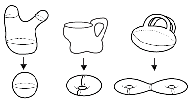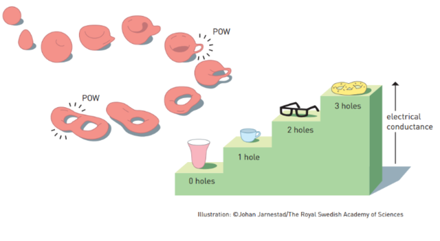 বিজ্ঞানীরা যখন দ্বিমাত্রিক এবং একমাত্রিক পদার্থের দশা পরিবর্তন নিয়ে চুল ছিঁড়ছেন, তখন হ্যান্স কস্টার্লিটজ এবং ডেভিড থুলেজ নামে দুইজন তাত্ত্বিক পদার্থবিদ সাহস করে এগিয়ে আসলেন। কস্টার্লিটজ এবং থুলেজ বললেন, দ্বিমাত্রিক পদার্থের ক্ষেত্রে বিজ্ঞানীরা যেভাবে সিমেট্রি খুঁজে বেড়াচ্ছেন, সেখানে আসলে গণ্ডগোল আছে। আমাদের জানাশোনা বিন্যাসভিত্তিক সিমেট্রির বাইরেও প্রকৃতির কাছে আরও অদ্ভুত সিমেট্রি আছে। সেই সিমেট্রি পেতে হলে আমাদের গণিতের কাছে যেতে হবে (কারণ গণিত খুব সম্ভবত একমাত্র ভাষা যেই ভাষায় প্রকৃতি আমাদের সাথে যোগাযোগ করে)। গণিতের এই সিমেট্রির নাম হলঃ টপোলজিক্যাল সিমেট্রি। এর উদ্ভব হয়েছে জ্যামিতির টপোলজি থেকে। এটা পদার্থের জ্যামিতিক আকার নিয়ে কাজ করে। সাধারণ জ্যামিতির ভাষায়, দুইটা সমান ব্যাসার্ধের বৃত্ত যেমন একই জিনিস, টপোলজির ভাষায় একটা গোলক আর একটা সিলিন্ডার আসলে একই জিনিস, কারণ গোলককে না ভেঙ্গে/ছিঁড়ে শুধু হাতুড়ি দিয়ে পিটিয়ে সিলিন্ডার বানিয়ে ফেলানো যায়। এখানে দুইটি বস্তু একই হওয়ার শর্ত হল, আপনি পরিবর্তনের সময় তাকে ছিঁড়তে বা ভাঙ্গতে পারবেন না এবং তার মাঝে যে কয়টা গর্ত আছে, সেই সংখ্যাটা অক্ষুণ্ণ রাখবেন। একই যুক্তিতে একটা আংটিকে হাতুড়ি দিয়ে পিটিয়ে আপনি একটা ফ্রিজবি বানিয়ে ফেলতে পারবেন, এমনকি ওই ফ্রিজবিকে আবার পিটিয়ে চা’য়ের কাপ বানিয়ে ফেলতে পারবেন। সুতরাং টপোলজিক্যালি এরা একই জিনিস। কস্টার্লিটজ এবং থুলেজ বললেন, পদার্থের মধ্যে যদি টপোলজিক্যাল সিমেট্রির পরিবর্তন হয়, তাহলেও পদার্থের দশা পরিবর্তিত হবে।