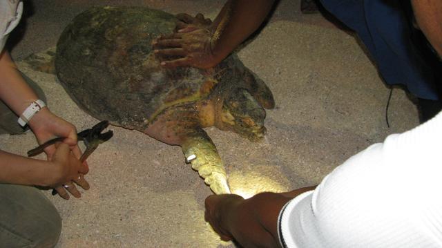 এর মধ্যে খবর এলো আমাদের আরেকটা দল একটা কচ্ছপের দেখা পেয়েছে - আমরা দ্রুত পা চালিয়ে পৌছে গেলাম কচ্ছপ শিকার থুক্কু বাচানোর জায়গায়। গিয়ে দেখলাম একটা মাঝারি সাইজের একটা কচ্ছপকে চেপে ধরে আছে এমেগ এর ফিল্ড এজেন্টরা। তানিয়া আমাদের জানালেন আমাদের সৌভাগ্য যে আমরা একটা একদম নতুন স্যাম্পল পেয়েছি। এই কচ্ছপটা আগে কোনো বিজ্ঞানী দলের নজরে পড়েনি - কারণ এটার গায়ে কোনো ট্যাগ নেই। কচ্ছপের খোলটা চিংড়ির খোসা বা মানুষের নখের মতই অনুভূতিহীন , আর এটা খসেও পরে না। তাই সারা পৃথিবীর সমুদ্রবিজ্ঞানিরা যখনি কোনো কচ্ছপের দেখা পান, তার খোলে বা নখে একটা ধাতব ট্যাগ পড়িয়ে দেন। ট্যাগে একটা নাম্বার থাকে যেটা ডাটাবেস এ সার্চ করলে ওই নাম্বারধারী কচ্ছপটি কবে কোথায় বিজ্ঞানীদের নজরে এসেছিল তা জানা যায়। সেই একই উদ্দেশ্যে এই কচ্ছপটাতেও ট্যাগ পরিয়ে দিলেন তানিয়া - তারপর ওটা গুট গুট করতে করতে সাগরে ফেরত গেল।