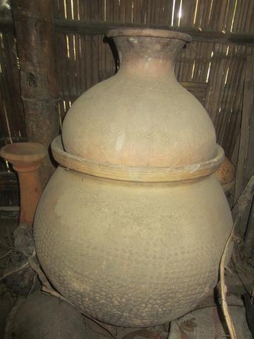 ভিতরে যেতেই দেখি ঘরের মেয়েরা কাঠের এক ধরণের পাটাতনের উপর কাঁদার অর্ধনির্মিত কলসি রেখে কাঠের হাতুড়ি দিয়ে পিটিয়ে পিটিয়ে কলসির পরিপূর্ণ আকার দিচ্ছে। আর ঘরের কর্তা গরুর গাড়ির চাকা বিশিষ্ট চাকা ঘুরিয়ে ঘুরিয়ে সম্পূর্ণ হাতের সাহায্যে মাটির ব্যাংক,প্রদীপ দানি বানিয়ে বানিয়ে রাখছে। জীবনে প্রথম আমি মুগ্ধ নয়নে দেখেছিলাম কুমারেরে হাতের ছোঁয়ায় এক মুঠো কাঁদা কিভাবে ছোট্ট সুন্দর প্রদীপদানির রুপ ধারণ করে। সুন্দর বলাতে দাদার কথায় ঘরের কিশোরী মেয়েটি আমার হাতে আগের বানানো একটি প্রদীপদানি দিয়ে যায়। আমি সেটি কিনতে চাইলে ,দাদু হাতের ইশারায় লাগবে না জানায়। ঘরের এক কোণে বসানো ছিল কলসি সদৃশ্য বড় আকৃতির মাটির তৈরী " গজা" (নিচের ছবি ) । নামটি আগে জানতাম না। এক সময় ধানের গোলা ন্যায় এটির ব্যবহার ছিল বলে মাসি জানায়। আলোর অভাবে ছবিটি তেমন ভাল আসেনি।