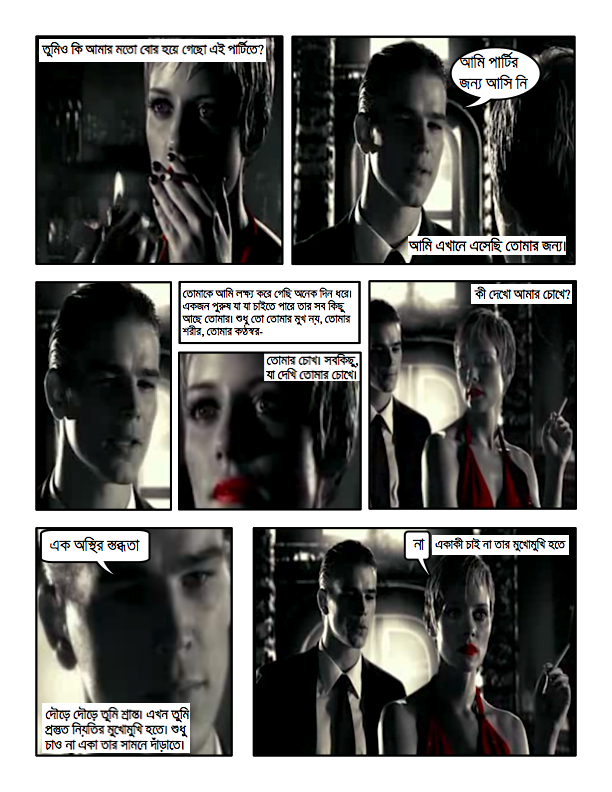 যাক, যাঁরা দেখেন নি সিনেমাটা তাঁদের জন্য সিনেমা থেকে স্ক্রিনশট নিয়ে অনেক সময় খরচ করে এই স্নিপেট অংশটার একটা কমিক্স রূপ বানিয়ে ফেললাম (একে গোয়িং ব্যাক টু দ্য রুটস বলা যায় না?)। হাতেনাতে লাভ কিছু হয় নি তা বলবো না, কমিক লাইফ বলে সফটওয়্যারটার সম্পর্কে জ্ঞানার্জন হয়ে গেলো এই সুবাদে। শিগগিরই ভুতুম পোস্ট দেবেন এই কমিক্স সিরিজ নিয়ে, আমার আশা আছে অনিকেত সিনেমাটা নিয়ে বিশদে লিখবেন যদি সাইফ তাঁকে রাজি করাতে পারেন (আর যদি সুজন চৌধুরিকেও পাওয়া যায়, আহা!)। সিন সিটির দ্বিতীয় ভাগ তৈরি হচ্ছে পড়লাম, এবং তৃতীয় ভাগও বানানোর ইচ্ছে আছে নির্মাতাদের। তার আগে প্রথম ভাগটা যদি এই সব লেখাটেখার দৌলতে সুজন চৌধুরির ভাষায় চাবাইয়া খাওয়া যায় তো খাসা হয়।