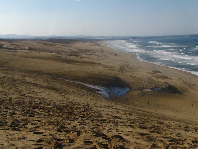 বালিয়াড়ি পৌঁছতে প্রায় দুপুর। জাপানের বড় বালিয়াড়ি তিনটা, তার মধ্যে পর্যটকদের কাছে জনপ্রিয় তত্তরির এই বালিয়াড়ি। বালিয়াড়িতে ঢোকার সিঁড়িতে “বালি নিয়ে যাওয়া নিষেধ” আর “বালিতে আঁকাজোকা করা নিষেধ” লিখে সতর্ক করে দেয়া, মজা লাগল। যতদূর চোখ যায় ধূধূ, হলুদ বালি আর বালি, যেন ক্ষুদ্র মরুভূমি একটা। তবে মরুভুমিতে দুপুরে গরমে প্রাণ ওষ্ঠাগত হয়, কিন্তু এখানে দিনদুপুরেও রীতিমত ঠাণ্ডা। ঢাল বেয়ে নামার পর একধারে ছোট্ট এক জলাধার মত, সেখানে পানি জমে আছে। তারপর আবার চড়াই বেয়ে ওঠা। উঁচুতে ওঠার পর হঠাৎ করে দিগন্তে প্রসারিত সমুদ্র, যেন চমকে দিতে বসে ছিল। কিছু জায়গায় বালিতে রাতে জমে থাকা তুষার গলে উঠে পারেনি। সেখানে বালি-তুষার-সমুদ্রে এক অদ্ভুত বিন্যাস। বালিয়াড়ির চূড়া থেকে নামার পথ বেশ খাড়া, নেমে আসলেই পায়ের কাছে জাপান সাগরের বিশাল উঁচু ঢেউ আছড়ে পড়ছে। জাপানে এর আগেও সাগর দেখেছি, কিন্তু এই সমুদ্রের কাছে তাদের সৌন্দর্যের তুলনা নেই। চারপাশে মানুষও বেশি না, শান্ত নীরব এই সাগরের তীরে বসে থেকেই দিন কাটিয়ে দেয়া যায়। বুঝলাম সাগরের বিশালতার কাছে মাঝেমধ্যে যেতে হয়, নিজেদের ক্ষুদ্রতা বুঝে নিতে।