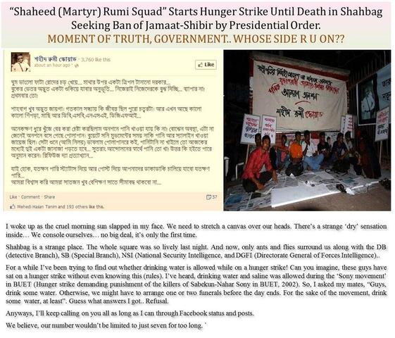 এই ছেলেগুলির পাশে দাড়ানোর মত মানুষ খুব বেশি নাই। তারা আন্দোলনের একটা এক্সট্রিম কিন্তু অহিংস পথ বেছে নিয়েছে। তাদের দাবীতে কোন ভুল নাই এবং এটা আমাদের সবার দাবী। গণজাগরণ মঞ্চ যদিও বলেছে এদের দাবী আর তাদের দাবী অভিন্ন কিন্তু একাত্মতা ঘোষনা তারা করবে না। সূতরাং এরা প্রায় নিঃসঙ্গ এবং এই কারনে র্যাব, পুলিশ, ডিবি, এনএসআই, ডিজিএফআই সবাই এদের হয়রানি করবে। সকাল থেকে সব কয়টা চ্যানেলের নিউজ ফলো করার চেষ্টা করলাম। সময় আর একাত্তর চ্যানেলে এক লাইন বলা ছাড়া আর কোন কাভারেজ তারা পাচ্ছে না। তাই আমাদের এই মুহূর্তে এদের পাশে দাঁড়ানো খুব জরুরী। লেটস স্প্রেড দেয়ার ওয়ার্ড। যতভাবে পারা যায়।