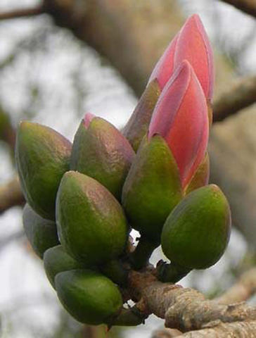 শীতের একেবারে শেষভাগে এসে ন্যাড়া শিমুল গাছের মঞ্জরিতে কুঁড়ি আসে। এর কুঁড়িগুলো দেখতে ভারি সুন্দর। ঠিক কুঁড়ি নয়, যেন সুস্বাদু ফল! শিমুলের মঞ্জরিও দেখার মতো। ছোটখাট একট ডাল যেন। ডালটার সারা গায়ে সার বেঁধে কুঁড়ি বের হয়। তার মানে মঞ্জরি বহুপুষ্পক। ফুলের কুঁড়ি আস্ত একটা সবুজ আবরণ দিয়ে ঢাকা থাকে। ধীরে ধীর সবুজ আবরণ ফেটে বেরিয়ে আসে আসল ফুল। কিন্তু কুঁড়ির ওই সবুজ আবরণ থেকেই যায়। পরিণত হয় সবুজ পাঁপড়িতে। ফুলের বোঁটার বেড় প্রায় ১ ইঞ্চি।